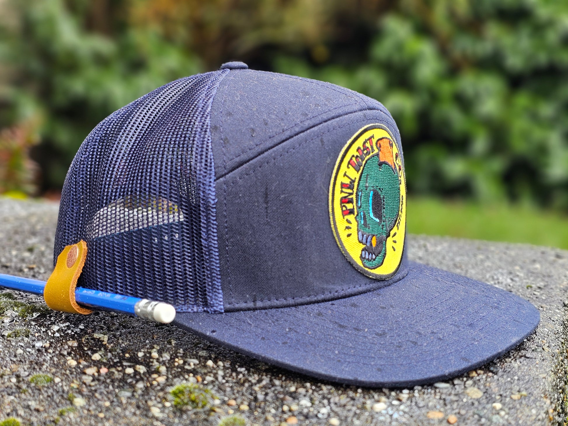 Snap back Richardson-168 with an embroidered patch and leather pencil/pen loop.